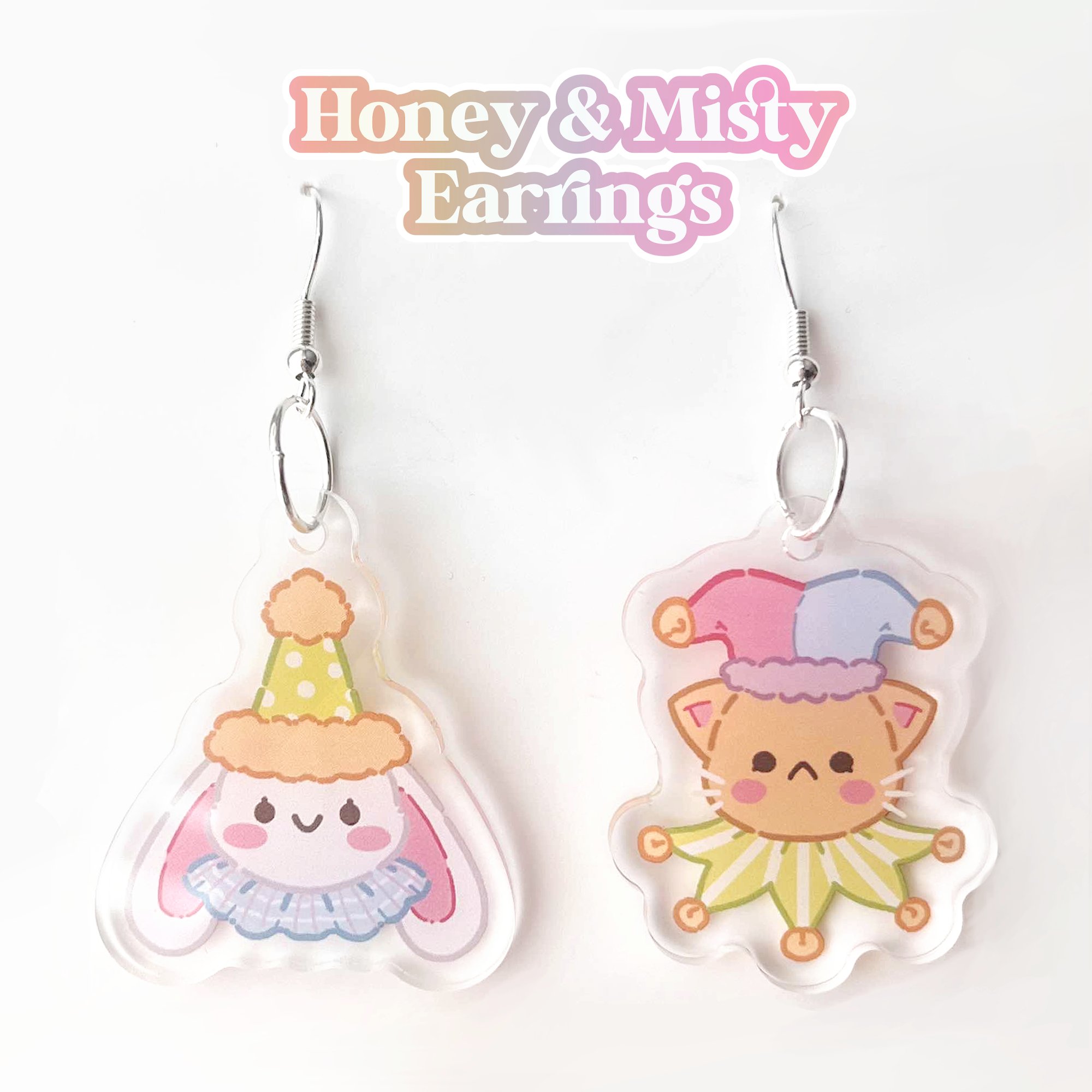 a mismatched pair of earrings, featuring the happy-go-lucky bunny honey and her slightly uncomfy friend misty!
